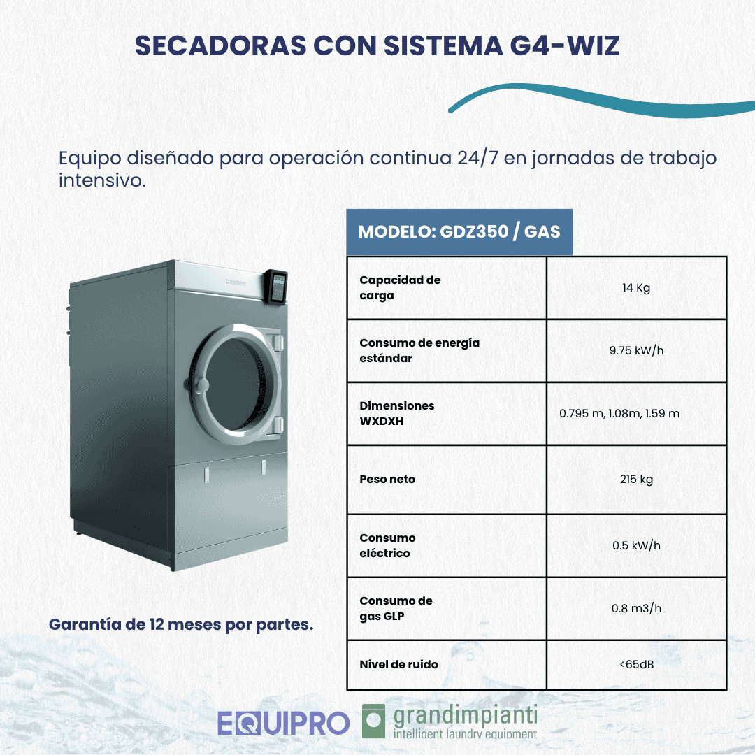 Secadora industrial a gas con sistema de control G-WIZ. Reduce el consumo gracias al aislamiento térmico. El tambor y los conductos de aire están aislados térmicamente para reducir la pérdida de calor y aprovechar al máximo el aire caliente. Diagrama de secado que permite alta capacidad de evaporación, no hay encogimiento de prendas, ausencia de fricción de entre las fibras. Características -Capacidad de tambor: 350dm3 -Capacidad: 14kg -Con inversor de giro en el tambor. -Tambor con recubrimiento de aluminio. -Filtro en acero inoxidable. -10 programas personalizados de secado. -Funcionamiento a gas. -Tensión eléctrica: 230 V -Consumo de energía: 0.5 Kw -Consumo de gas GLP: 0.8 m3/h -Dimensiones LxDxH:795x1085x1590mm -Peso neto: 215 kg