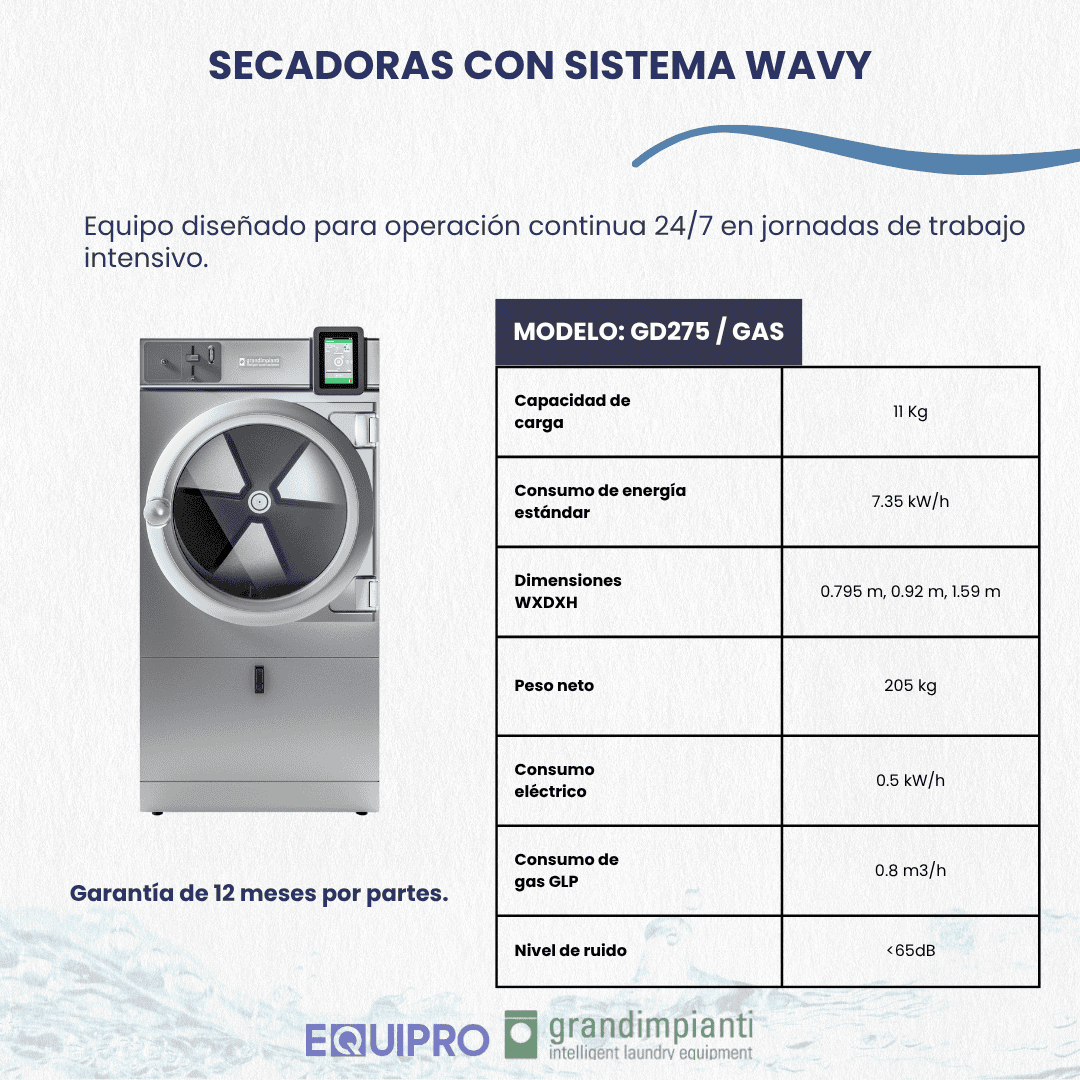 Secadora industrial a gas con sistema de control Wavy. Tecnología avanzada con calefacción mediante quemador de gas de titanio con control electrónico de seguridad contra incendios. Características: -Con inversor de giro en el tambor. -Tambor con recubrimiento de aluminio. -Filtro en acero inoxidable. -Cuenta con pantalla táctil de 7" -Número ilimitado de programas personalizados de secado. -Cuenta con sistema de gestión inteligente. Reduce los consumos energéticos modulando la intensidad y duración del ciclo. -Funcionamiento a gas, puede trabajar con todos los tipos de gas cambiando la boquilla. Especificaciones técnicas -Capacidad de tambor: 275dm3 -Capacidad: 11kg -Tensión eléctrica: 220 V 1∼ 60Hz -Consumo eléctrico: 0.5 Kw/h -Consumo de gas GLP: 0.8 m3/h Dimensiones LxDxH: 795 x 920 x 1590 mm Peso neto: 215 kg