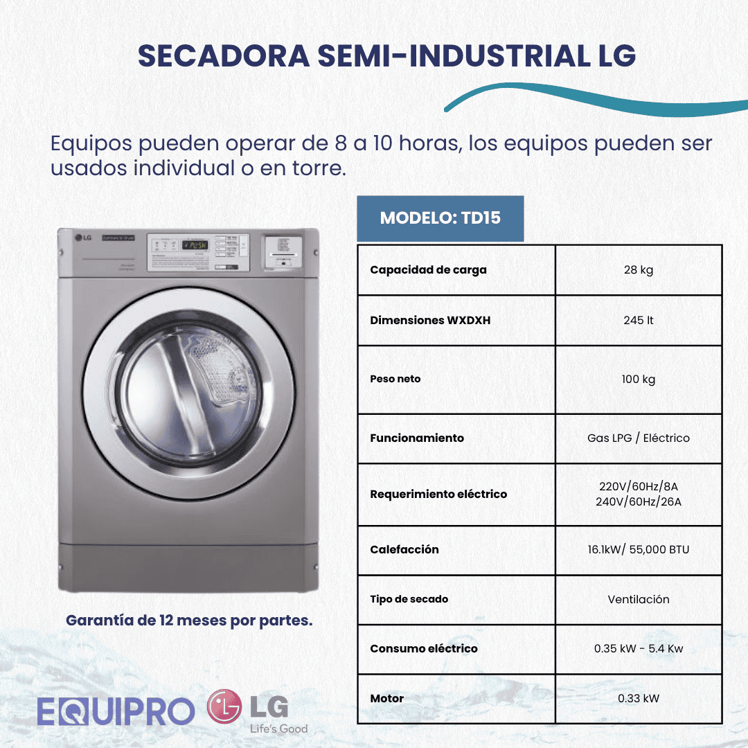 Combina una gran capacidad con una alta eficiencia energética, ofreciendo un secado sobresaliente. Su diseño atractivo capta la atención de los clientes, y su capacidad superior permite secar edredones y cargas grandes con facilidad. -Marca: LG -Volumen del tambor cu.ft (l): 9.0 (254) -Tambor de acero inoxidable -Capacidad de carga: 15 kg -4 programas de secado predeterminado -Pueden operar entre 8 a 10 horas consecutivas. Dimensiones del Equipo: -Producto (an x al x prof): 68.6 x 111.4 x 106 cm -Peso (Máquina/Embalaje): 100/108 kg Conexiones: -Diámetro salida de aire: 6 (154) in. (mm) -Diámetro tubo extracción flujo: 6 (154) in. (mm) Consumo de energía: 5.4 kW Conexión eléctrica: 110 ó 220V Si el equipo funciona a gas/eléctrico: -Tipo de calentamiento: Gas -Calificación gas: 55,000 BTU -Consumo de energía: 0.35 kW *Se puede utilizar en formato torre con la secadora modelo TW15*