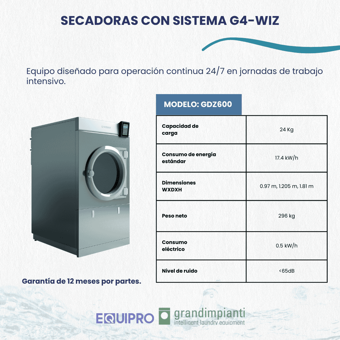 Secadora industrial eléctrica con sistema de control G-WIZ Reduce el consumo gracias al aislamiento térmico. El tambor y los conductos de aire están aislados térmicamente para reducir la pérdida de calor y aprovechar al máximo el aire caliente. Diagrama de secado que permite alta capacidad de evaporación, no hay encogimiento de prendas, ausencia de fricción de entre las fibras. Características: -Con inversor de giro en el tambor. -Tambor con recubrimiento de aluminio. -Filtro en acero inoxidable. -10 programas personalizados de secado. -Funcionamiento a gas, puede trabajar con todos los tipos de gas cambiando la boquilla. Especificaciones técnicas: -Capacidad de tambor: 600dm3 -Capacidad: 24kg -Tensión eléctrica: 230 V 3 ∼ 60 Hz -Consumo eléctrico: 17.4 Kwh -Dimensiones LxDxH: 970 X 1205 X 1810 -Peso neto: 296 Kg