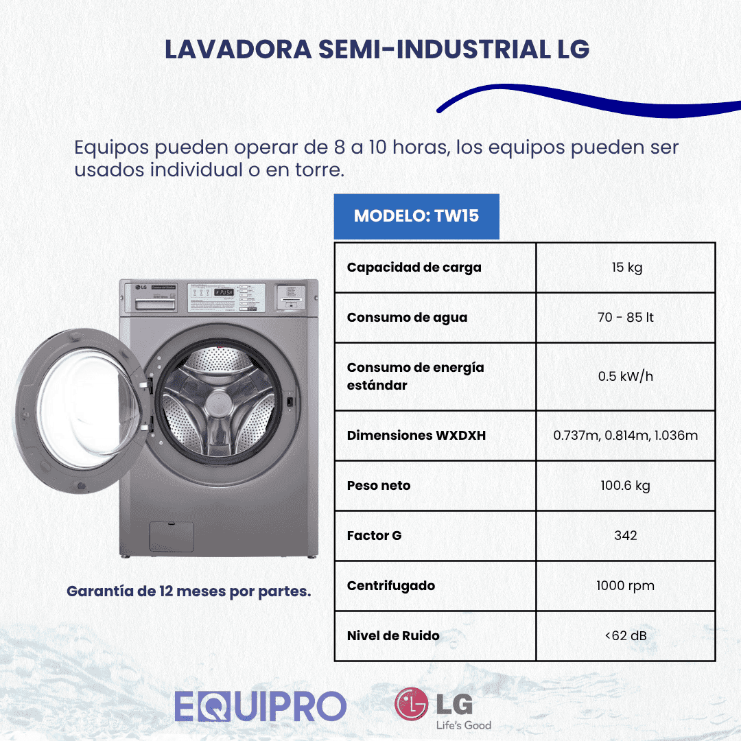Combina una gran capacidad con una alta eficiencia energética, ofreciendo un lavado sobresaliente. Su diseño atractivo capta la atención de los clientes, y su capacidad superior permite lavar edredones y cargas grandes con facilidad. -Marca: LG -Volumen del tambor: 5.2 cu.ft (l) -Capacidad (1:10): 14/30 kg/lb -Capacidad Máx. de lavado: 17/37 kg/lb -Dispensador de productos de 3 compartimentos -5 programas de lavado -Pueden operar entre 8 a 10 horas consecutivas. DIMENSIONES -Producto (an x al x prof): 73.7 x 103.6 x 82.1 cm -Peso (Máquina/Embalaje): 102/121 kg Material de fabricación: -Tambor de acero inoxidable -Panel de control: Realizado en acero -Aro exterior del tambor: Aluminio Consumo agua: 70-85 litros Consumo de energía: 0.5 kW Conexión eléctrica. 110 ó 220 V *Se puede utilizar en formato torre con la secadora modelo TD15*