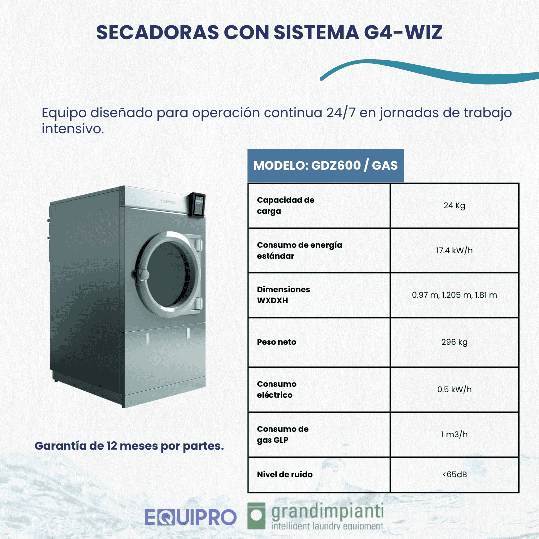 Secadora industrial a gas con sistema de control G-WIZ Reduce el consumo gracias al aislamiento térmico. El tambor y los conductos de aire están aislados térmicamente para reducir la pérdida de calor y aprovechar al máximo el aire caliente. Diagrama de secado que permite alta capacidad de evaporación, no hay encogimiento de prendas, ausencia de fricción de entre las fibras. Características: -Con inversor de giro en el tambor. -Tambor con recubrimiento de aluminio. -Filtro en acero inoxidable. -10 programas personalizados de secado. -Funcionamiento a gas, puede trabajar con todos los tipos de gas cambiando la boquilla. Especificaciones técnicas: -Capacidad de tambor: 600dm3 -Capacidad: 24kg -Tensión eléctrica: 230 V 3 ∼ 60 Hz -Consumo eléctrico: 0.5 Kw/h -Consumo de gas GLP: 1 m3/h -Capacidad de evaporación: 20.6 lt/h -Nivel de ruido abajo de 55 dB -Dimensiones WxDxH: 970 X 1205 X 1810 mm -Peso: 296 kg