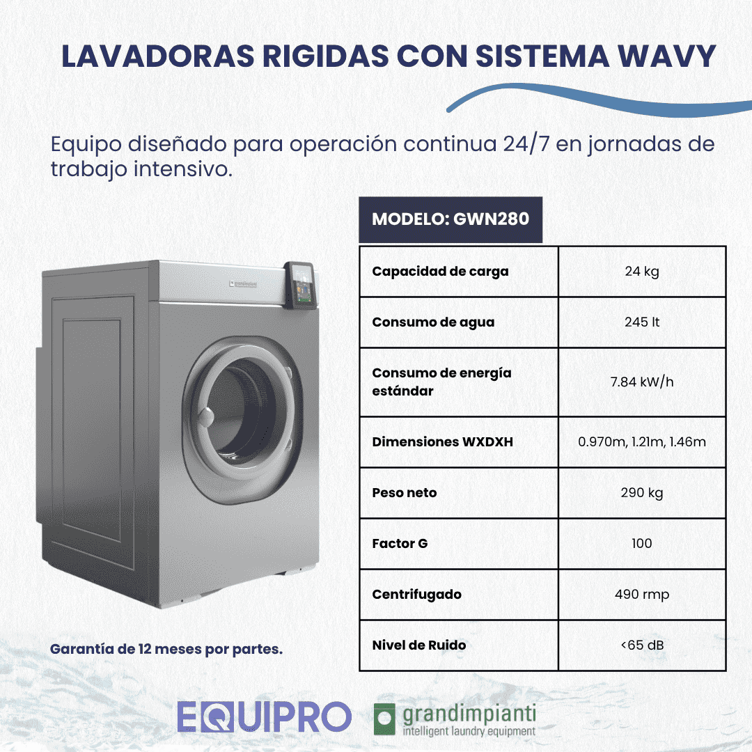 Lavadora de velocidad normal de centrifugado. Equipadas con un tambor de acero inoxidable con una estructura especial de semiesfera que evita que la fricción dañe las prendas. Estas máquinas pueden lavar tanto un traje de negocios como un vestido de novia. Características: -Capacidad: 28 Kg -Velocidad manejada electrónicamente con un inverter por sensor de rotación. -Dispensador de 4 compartimientos ubicados de forma ergonómica para colocar de forma manual químicos de preferencia (detergente, suavizante, cloro, entre otros) -3 entradas para agua: caliente, fría fuerte, fría suave -Potente motor capaz de generar hasta 100G de fuerza centrífuga -Sistema de pesaje (WDS) patentado para pesar de forma automática la ropa y regular los consumos como agua, energía y químicos. -Control Wavy: interfaz sencilla e intuitiva que se adapta a las necesidades del usuario. Pantalla de 7" siempre visible y fácil de usar con guantes -Programas ilimitados de lavado -Apertura del tambor 180° lo que permite facilitar el proceso de carga y descarga -Tubería de agua ¾ -Válvula de vaciado de 3" Medidas LxDxH: 970 x 1210 x1460 mm Peso neto: 290kg Tensión eléctrica: 230 V 60 Hz Consumo eléctrico estándar:7.847kWh