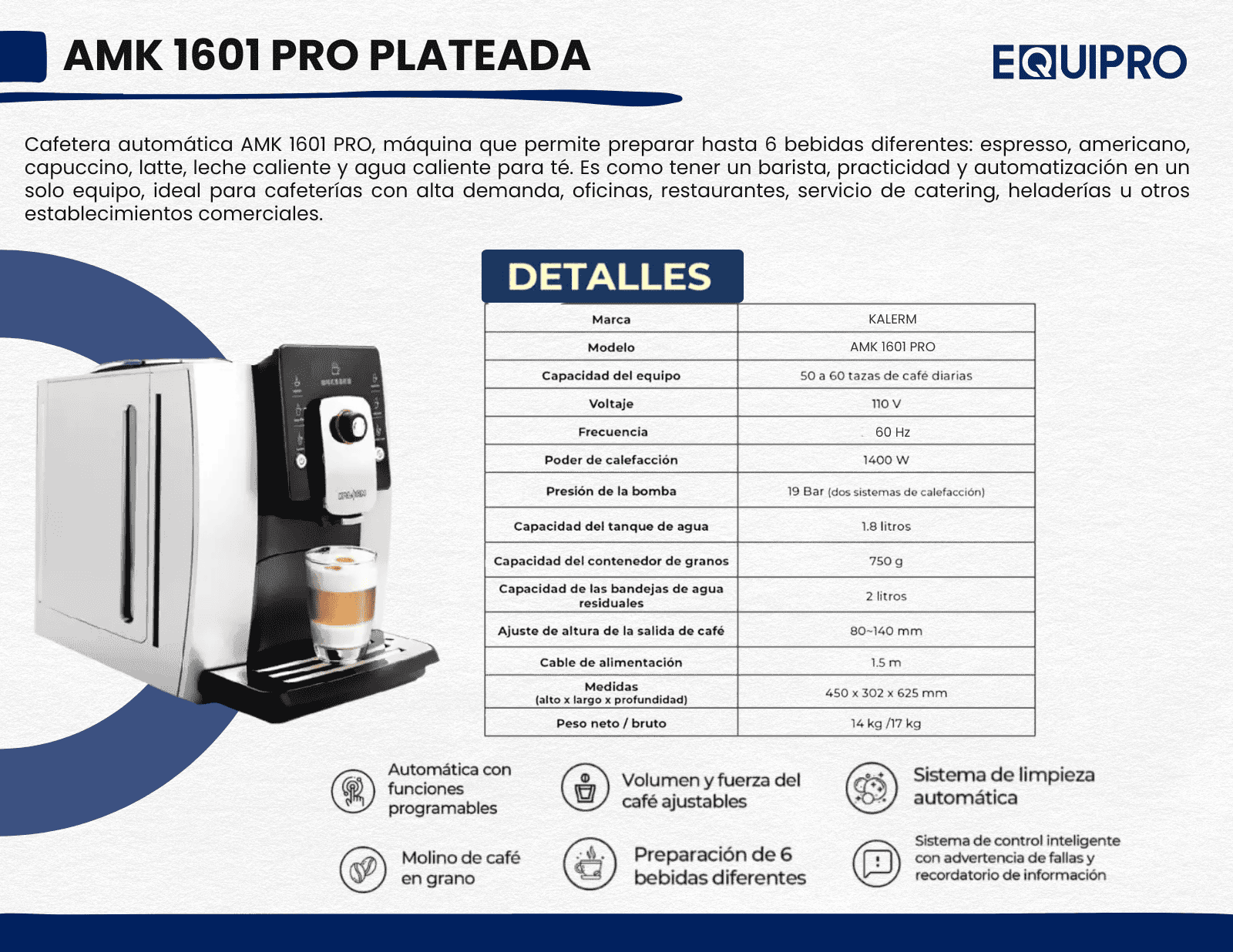 La cafetera automática AMK 1601 PRO es un equipo de alto rendimiento diseñado para preparar hasta 6 tipos de bebidas a base de café, incluyendo espresso, long coffee, cappuccino, latte, leche caliente y agua para té. Ideal para entornos comerciales con alta demanda como cafeterías, oficinas y restaurantes, esta máquina combina la función de un barista con la automatización, ofreciendo practicidad y eficiencia. Cuenta con una capacidad de producción de 50 a 60 tazas diarias, un poder de calefacción de 1400 W, y una bomba de presión de 19 bares para asegurar la calidad del café. Además, incluye un molino de café en grano y un sistema de limpieza automática, lo que la convierte en una opción óptima para el servicio de catering, heladerías y otros establecimientos comerciales que buscan consistencia y calidad en cada taza.