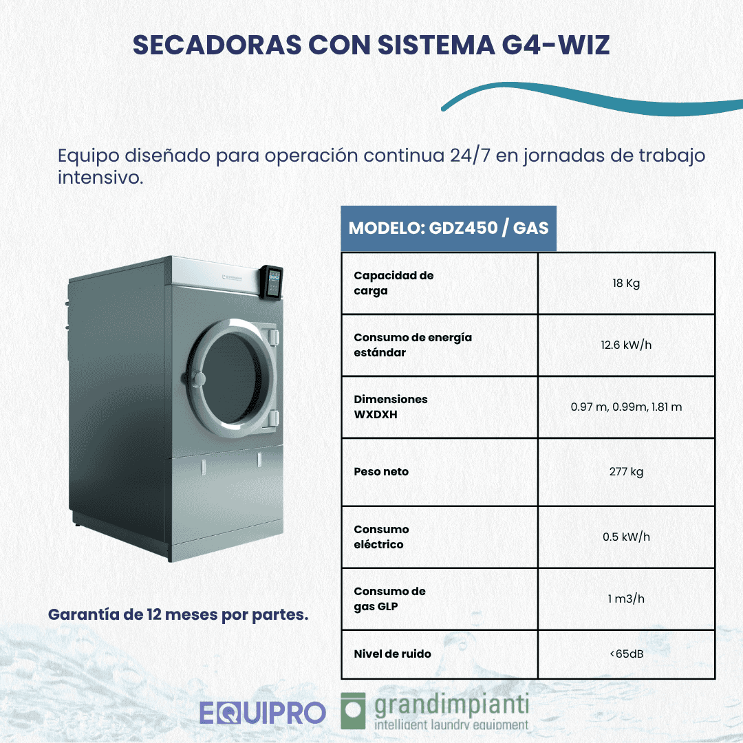 Secadora industrial a gas con sistema de control G-WIZ. Reduce el consumo gracias al aislamiento térmico. El tambor y los conductos de aire están aislados térmicamente para reducir la pérdida de calor y aprovechar al máximo el aire caliente. Diagrama de secado que permite alta capacidad de evaporación, no hay encogimiento de prendas, ausencia de fricción de entre las fibras. Características: -Con inversor de giro en el tambor. -Tambor con recubrimiento de aluminio. -Filtro en acero inoxidable. -10 programas personalizados de secado. Especificaciones técnicas: -Capacidad de tambor: 350dm3 -Capacidad: 18kg -Tensión eléctrica: 230 V -Consumo eléctrico: 0.5 Kw/h -Consumo de gas GLP: 1 m3/h Medidas LxDxW: 970 x 990 x 1810 mm Peso neto: 277 Kg