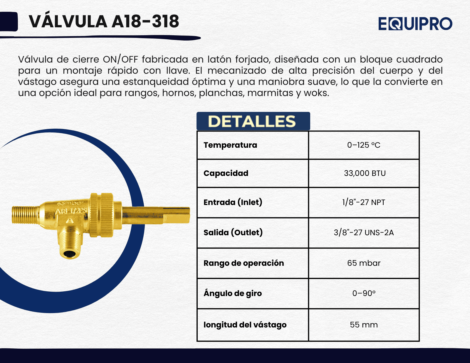 500 UNIDADES Valvula de paso sin sistema de seguridad BTU: 33,000 Inlet: 1/8""-27NPT Outlet: 3/8""-27UNS-2A Marca: Alphabrass