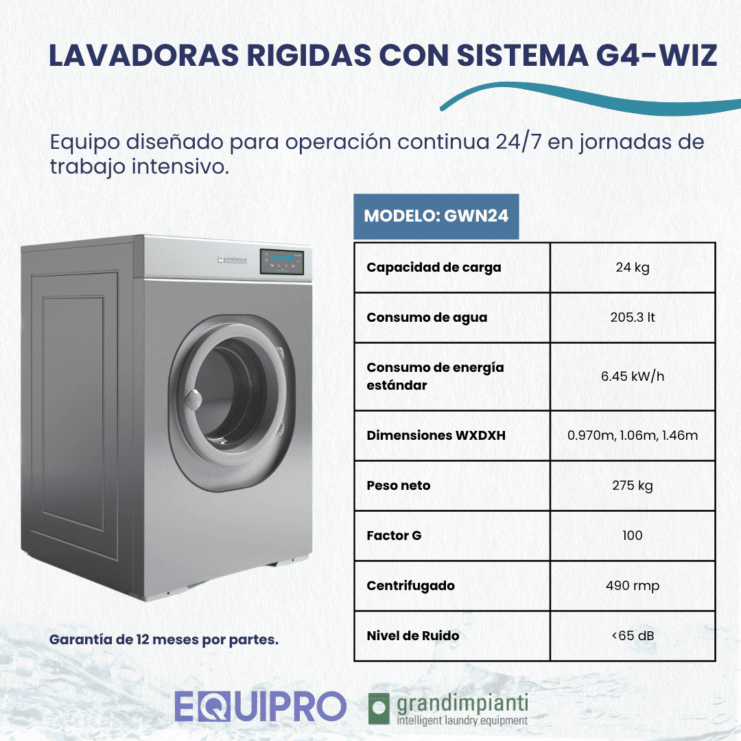 La lavadora GWN24 es una lavadora industrial de normal velocidad de centrifugado. Diseño robusto y confiable para uso industrial intensivo con alto rendimiento y eficiencia. Eficiencia y tecnología avanzada para su negocio. Características: -Capacidad de carga: 24 Kg -Motor capaz de generar hasta 100G de fuerza centrífuga. Velocidad de 490 RPM -Sistema de pesaje (DWS) para optimizar consumo de agua y detergente según carga. -Dispensador de 4 compartimientos ubicados de forma ergonómica para colocar de forma manual químicos de preferencia (detergente, suavizante, cloro, entre otros) -3 entradas para agua: caliente, fría fuerte, fría suave -Control G4-WIZ® con 20 programas de libre ajuste. -Apertura del tambor 180° lo que permite facilitar el proceso de carga y descarga. -Tubería de agua ¾ -Válvula de vaciado de 3" -LxDxH: 970 x 1060 x 1460 x mm Volumen del tambor 0.24 m3 Tensión eléctrica: Voltaje 230/3/60 Hz