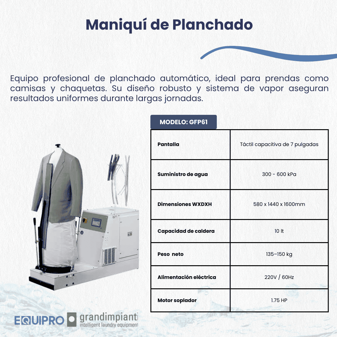 Maniquí profesional con caldera de 10 litros, bomba integrada y motor soplador de 1,75 HP. Equipado con pantalla táctil capacitiva de 7”, panel de control electrónico, sobrecalentador de acero inoxidable y sistema de pulverización de vapor para un acabado perfecto. Suministro de agua: 300 a 600 kPa Medida de la entrada para conectar agua: 3/8" Dimensiones WxDxH: 580 x 1440 x 1600 mm Peso neto: 135kg Tensión eléctrica: 230-240V 3~50/60Hz
