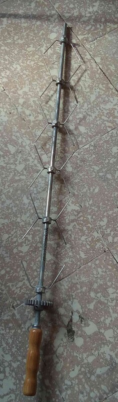 8.03.01.00120001 ESPADA PARA ROSTIZADOR DE POLLO •Sujetador de madera •Engranaje Aluminio Inyectado 76x24mm F.1/2 30D •2 ganchos simples •4 ganchos dobles •Capacidad para 5 pollos •Marca: Venancio