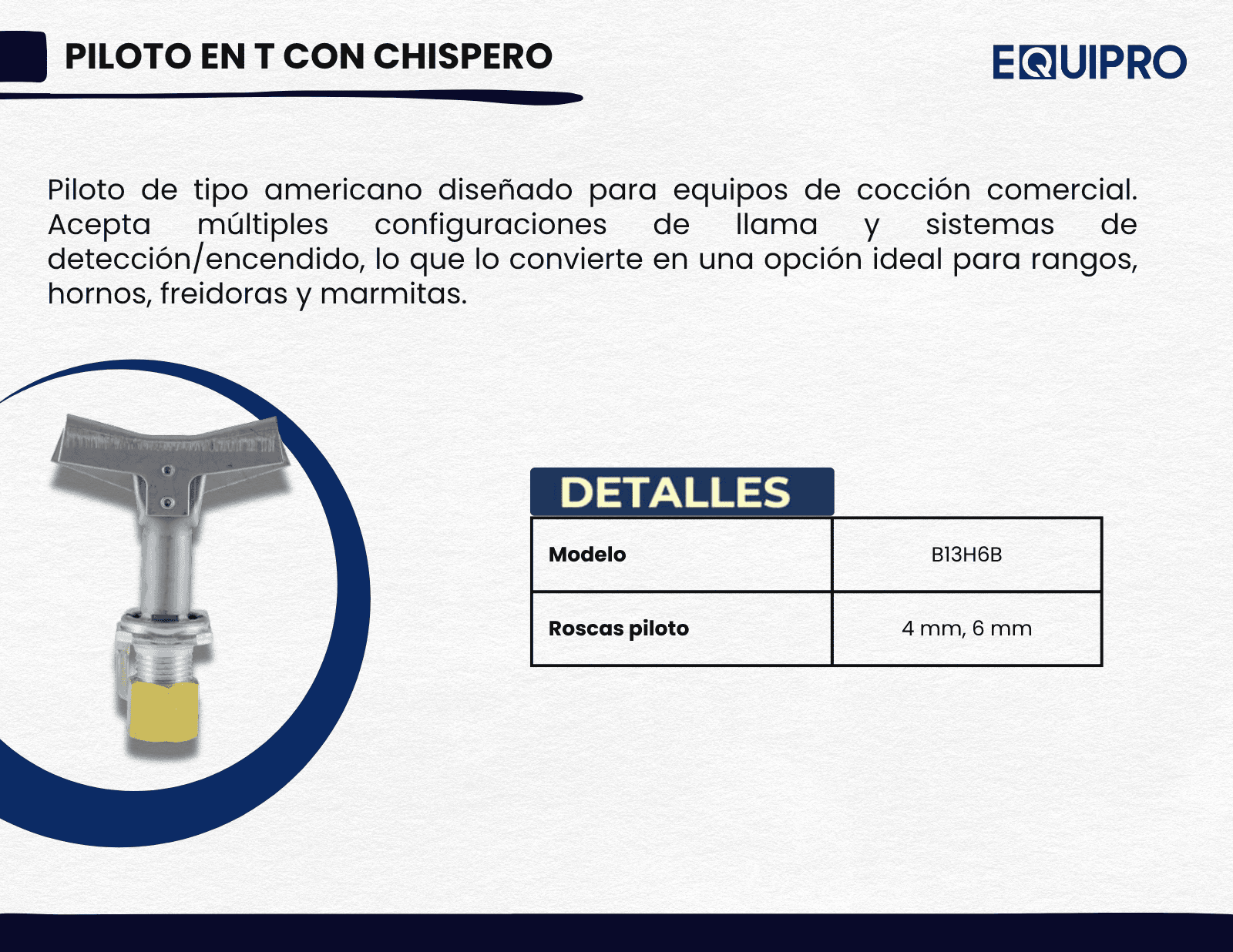 Piloto tipo americano para equipos de cocción comercial. Acepta múltiples configuraciones de llama y de detección/encendido, ideal para rangos, hornos, freidoras y marmitas