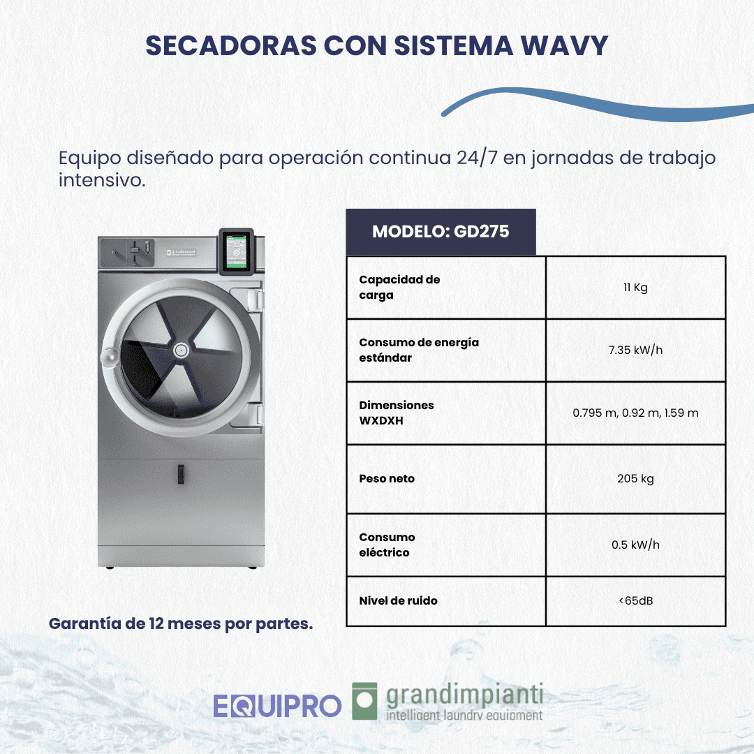 Secadora industrial eléctrica con sistema de control Wavy. Tecnología avanzada con calefacción mediante quemador de gas de titanio con control electrónico de seguridad contra incendios. Características: -Con inversor de giro en el tambor. -Tambor con recubrimiento de aluminio. -Filtro en acero inoxidable. -Cuenta con pantalla táctil de 7" -Número ilimitado de programas personalizados de secado. -Cuenta con sistema de gestión inteligente. Reduce los consumos energéticos modulando la intensidad y duración del ciclo. Especificaciones técnicas -Capacidad de tambor: 275dm3 -Capacidad: 11kg -Tensión eléctrica: 220 V 1∼ 60Hz -Consumo eléctrico: 7.35 Kw/h -Dimensiones LxDxH: 795 x 920 x 1590mm Peso neto:215 Kg